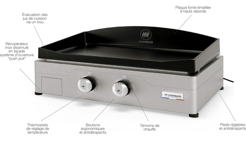 LE MARQUIER elektrische planchas bieden kookvermogen gelijk aan gasplanchas dankzij hun innovatieve stralingssysteem. Deze technologie zorgt veilig voor een ultra-snelle temperatuurstijging van 0° tot 300 °C in enkele minuten, met een gelijkmatige warmteverdeling over het gehele oppervlak. Kook moeiteloos hartige of zoete gerechten met precisie met ergonomische, gegradueerde bedieningsknoppen.